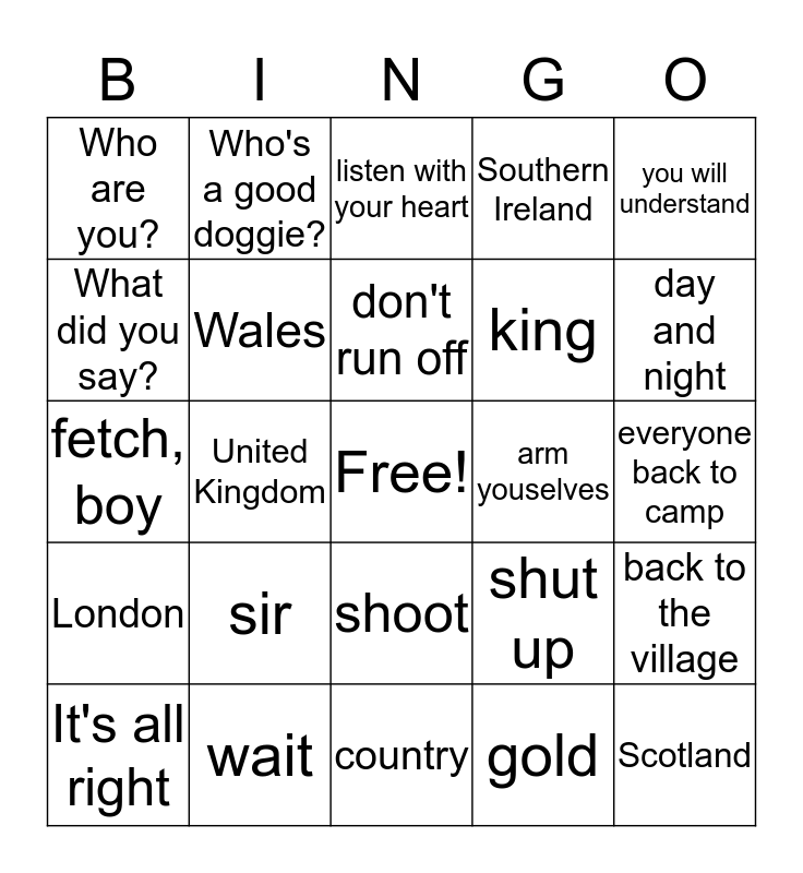 This bingo card has a free space and 24 words: sir, wait, don't run off, It's all right, you will understand, Who are you?, What did you say?, Who's a good doggie?, arm youselves, shoot, king, fetch, boy, shut up, back to the village, Wales, gold, everyone back to camp, listen with your heart, day and night, United Kingdom, Scotland, London, Southern Ireland and country.