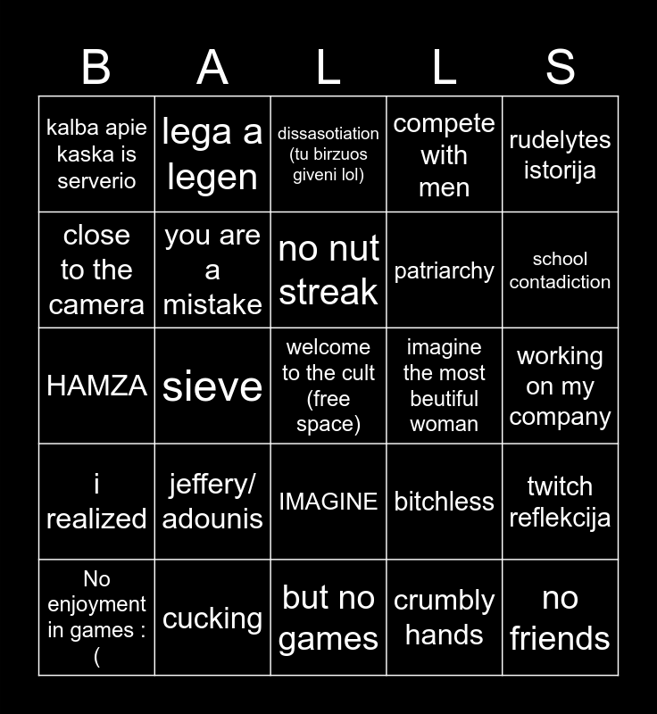 This bingo card has a free space and 26 words: IMAGINE, crumbly hands, no nut streak, cucking, rudelytes istorija, kalba apie kaska is serverio, close to the camera, lega a legen, working on my company, bitchless, patriarchy, HAMZA, twitch reflekcija, No enjoyment in games :(, sieve, "i did not smile once", compete with men, i realized, dissasotiation (tu birzuos giveni lol), no friends, school contadiction, but no games, imagine the most beutiful woman, jeffery/ adounis, you are a mistake and Gedvilas cetified.
