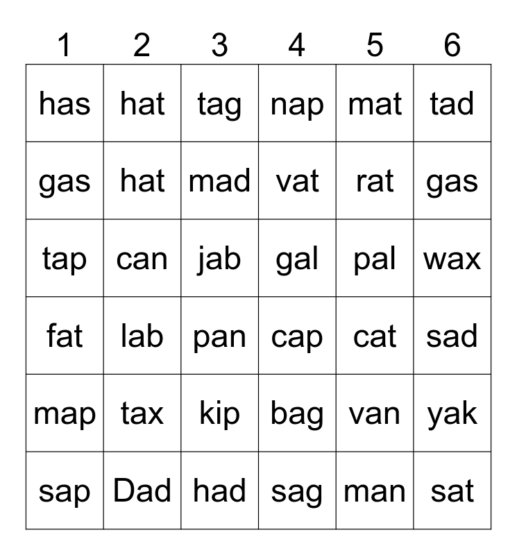 This bingo card has 36 words: bag, kip, sag, gas, fat, gal, hat, had, mat, van, gas, nap, yak, can, vat, has, map, pal, tap, tag, jab, lab, cap, pan, cat, hat, rat, Dad, mad, tad, sat, sap, sad, wax, tax and man.
