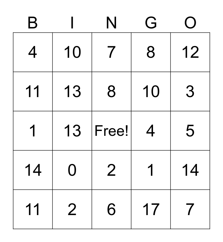 This bingo card has a free space and 34 words: 18, 17, 16, 15, 14, 13, 12, 11, 10, 9, 8, 7, 6, 5, 4, 3, 2, 1, 0, 1, 2, 3, 4, 5, 6, 7, 8, 9, 10, 11, 12, 13, 14 and 15.