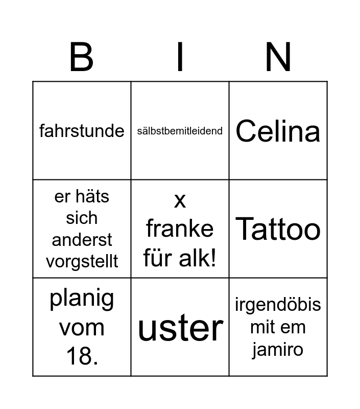 This bingo card has a free space and 8 words: Tattoo, Celina, sälbstbemitleidend, planig vom 18., fahrstunde, irgendöbis mit em jamiro, er häts sich anderst vorgstellt and uster.