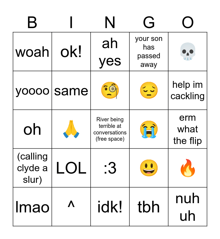 This bingo card has a free space and 44 words: 😨, nuh uh, mmm, lmao, hmm, tbh, ah yes, i-, 💀, ^, your son has passed away, 😭, :3, LOL, ooo, idk!, smh, oh, fr, help im cackling, ok!, ah, true…, woah, -, erm what the flip, gottem, ~, 😃, (calling clyde a slur), :O, 🔥, (something related to Omori), yum, 🙏, _:ok, rn, bruh/bruv, 🧐, yoooo, 😔, relatable, same and mood.