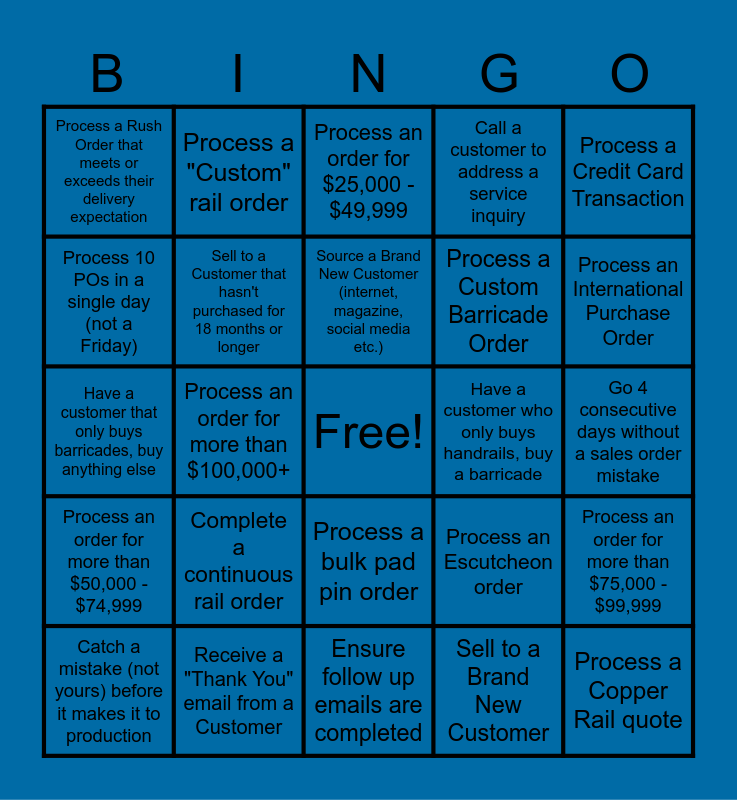 This bingo card has a free space and 24 words: Complete a continuous rail order, Receive a "Thank You" email from a Customer, Source a Brand New Customer (internet, magazine, social media etc.), Catch a mistake (not yours) before it makes it to production, Process a Credit Card Transaction, Process a Rush Order that meets or exceeds their delivery expectation, Process 10 POs in a single day (not a Friday), Process a "Custom" rail order, Have a customer who only buys handrails, buy a barricade, Process a bulk pad pin order, Process a Custom Barricade Order, Have a customer that only buys barricades, buy anything else, Process an Escutcheon order, Process an order for more than $75,000 - $99,999, Sell to a Customer that hasn't purchased for 18 months or longer, Sell to a Brand New Customer, Go 4 consecutive days without a sales order mistake, Process an order for $25,000 - $49,999, Process an International Purchase Order, Process an order for more than $100,000+, Process a Copper Rail quote, Process an order for more than $50,000 - $74,999, Call a customer to address a service inquiry and Ensure follow up emails are completed.