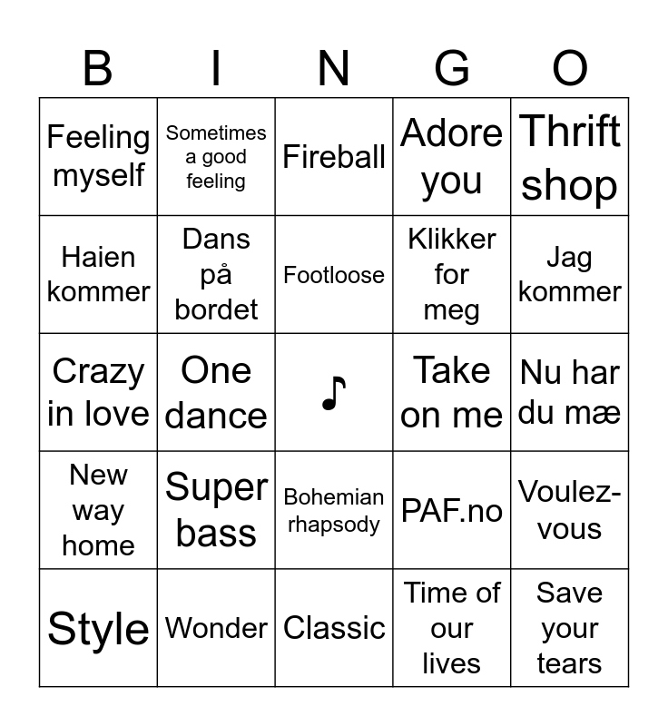 This bingo card has a free space and 44 words: Mamma mia, Save your tears, Sexyback, Style, Rain over me, Time of our lives, Fireball, Herlige fredag, Thrift shop, Wonder, Adore you, Take on me, Bohemian rhapsody, Super bass, Party in the U.S.A., Classic, Hotel room service, Crazy in love, Good time, Jag kommer, Sometimes a good feeling, Believe, Alt jeg ser, Feeling myself, Unwritten, Nu har du mæ, ME!, Bling, PAF.no, New way home, One more night, Voulez-vous, Without you, Vegas, One dance, Raise your glass, Freaky like me, Summertime sadness, Footloose, Haien kommer, Klikker for meg, Country roads, Dans på bordet and Va va voom.