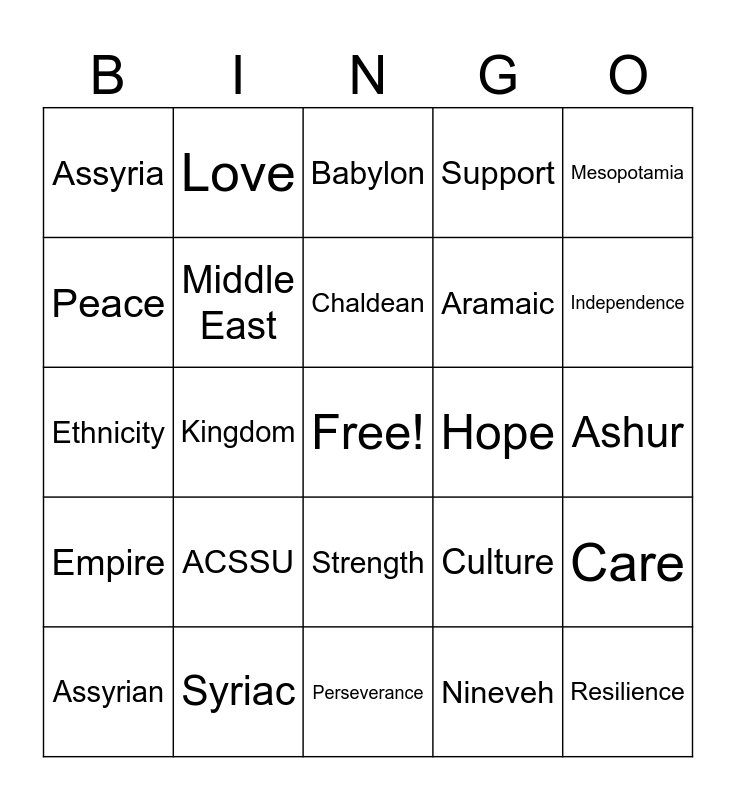This bingo card has a free space and 24 words: ACSSU, Syriac, Chaldean, Assyrian, Mesopotamia, Assyria, Peace, Love, Hope, Strength, Aramaic, Ethnicity, Culture, Care, Middle East, Nineveh, Ashur, Babylon, Independence, Kingdom, Resilience, Empire, Support and Perseverance.