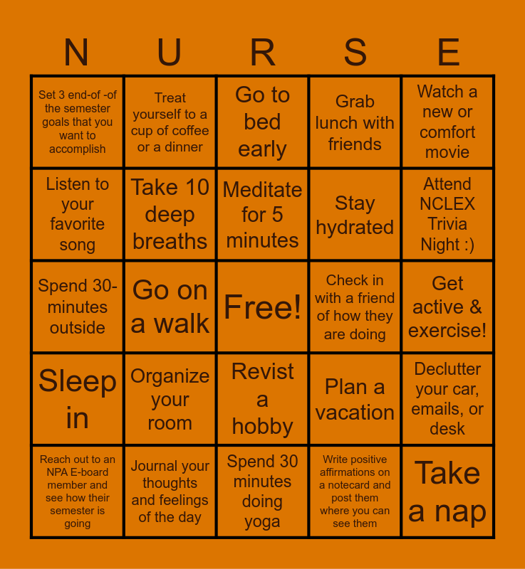 This bingo card has a free space and 24 words: Reach out to an NPA E-board member and see how their semester is going, Organize your room, Meditate for 5 minutes, Write positive affirmations on a notecard and post them where you can see them, Watch a new or comfort movie, Set 3 end-of -of the semester goals that you want to accomplish, Treat yourself to a cup of coffee or a dinner, Go to bed early, Check in with a friend of how they are doing, Get active & exercise!, Spend 30-minutes outside, Take 10 deep breaths, Plan a vacation, Declutter your car, emails, or desk, Listen to your favorite song, Journal your thoughts and feelings of the day, Spend 30 minutes doing yoga, Grab lunch with friends, Attend NCLEX Trivia Night :), Sleep in, Go on a walk, Revist a hobby, Stay hydrated and Take a nap.