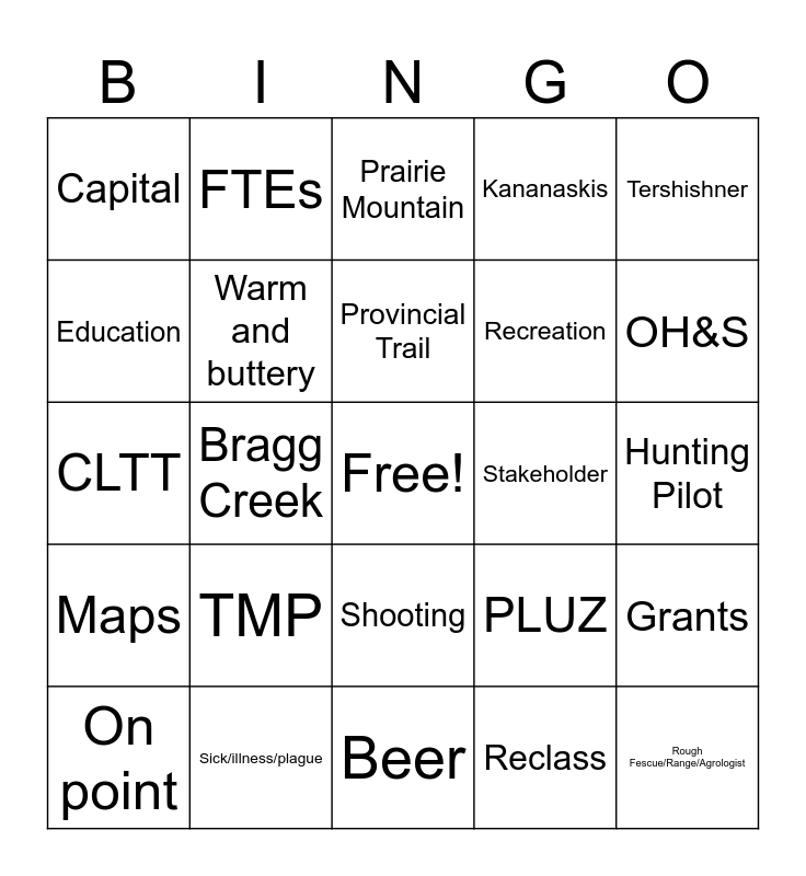 This bingo card has a free space and 36 words: 1GX, It is what it is, cool, cool, cool, Warm and buttery, PLUZ, Maps, Provincial Trail, Ghost, Tershishner, Rail Trail, Bragg Creek, Kananaskis, OHV, Stakeholder, OH&S, Capital, REO, TMP, Rough Fescue/Range/Agrologist, Prairie Mountain, Hunting Pilot, Grants, Sick/illness/plague, On point, Beer, FTEs, CLTT, Bridge, Recreation, Education, Partnership(s), 310-LAND, Reclass, Shooting, Sharepoint and Circle back.