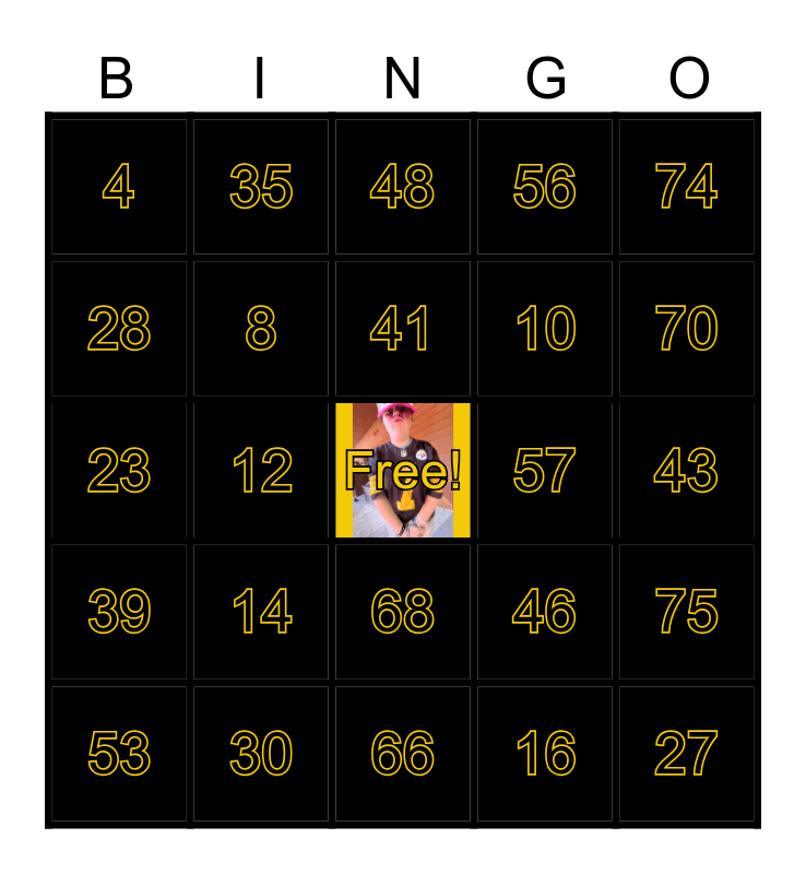 This bingo card has a free space and 24 words: 14, 30, 41, 53, 74, 4, 28, 35, 57, 68, 10, 23, 46, 75, 8, 16, 43, 48, 70, 12, 27, 39, 56 and 66.