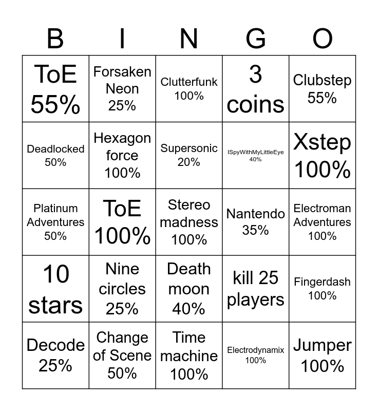 This bingo card has a free space and 24 words: Nine circles 25%, Change of Scene 50%, Supersonic 20%, Decode 25%, Clubstep 55%, ToE 55%, Deadlocked 50%, Forsaken Neon 25%, Nantendo 35%, Death moon 40%, ISpyWithMyLittleEye 40%, Platinum Adventures 50%, kill 25 players, Fingerdash 100%, Hexagon force 100%, Electrodynamix 100%, Electroman Adventures 100%, Clutterfunk 100%, Xstep 100%, ToE 100%, Jumper 100%, 10 stars, 3 coins and Time machine 100%.