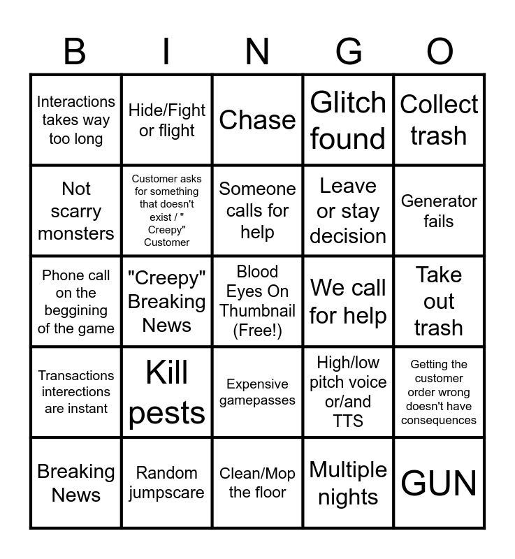 This bingo card has a free space and 24 words: Kill pests, Random jumpscare, Someone calls for help, Breaking News, Collect trash, Interactions takes way too long, Not scarry monsters, Hide/Fight or flight, We call for help, Expensive gamepasses, Leave or stay decision, Phone call on the beggining of the game, High/low pitch voice or/and TTS, Getting the customer order wrong doesn't have consequences, Customer asks for something that doesn't exist / " Creepy" Customer, Multiple nights, Take out trash, Chase, Generator fails, "Creepy" Breaking News, GUN, Transactions interections are instant, Glitch found and Clean/Mop the floor.
