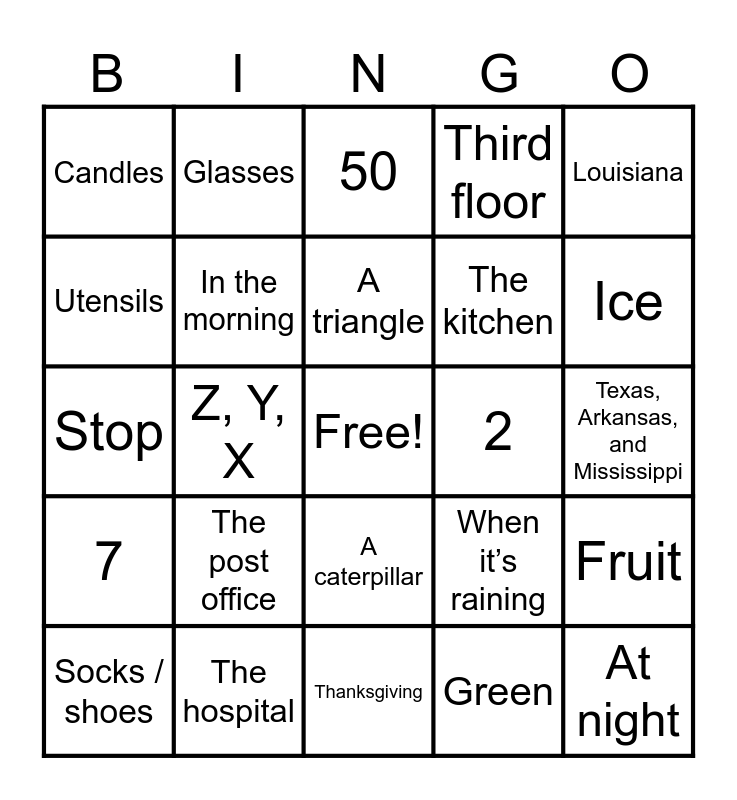 This bingo card has a free space and 59 words: Blue, The hospital, Daytime, 7, Green, Our Lady of the Lake, In the morning, A clock, The kitchen, LSU, Third floor, 52 weeks, Utensils, Winter, On a toothbrush, Candles, At night, Louisiana, The zoo, A triangle, 2, 50, Socks / shoes, Fruit, February 14, Baseball, Baton Rouge, In the ocean, Ice, When it is raining outside, 7 months, The dentist, A refrigerator, George Washington, Glasses, The library, 32, Z, Y, X, Monday, Stop, 8, The post office, Texas, Arkansas, and Mississippi, The beach, A bus, A washing machine, Baton Rouge, In a nest, A caterpillar, Thanksgiving, Yes, Summer, winter, fall, spring, In a bed, A zebra, A ring, When it’s raining, Yellow and blue, A plumber and A spoon.