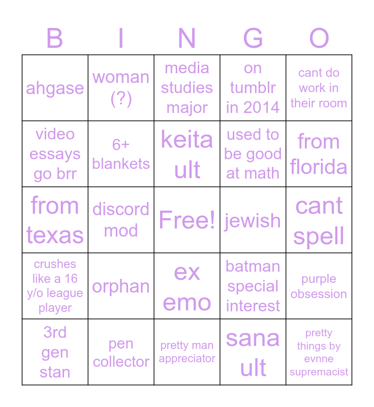 This bingo card has a free space and 24 words: orphan, pen collector, keita ult, 3rd gen stan, cant do work in their room, ahgase, video essays go brr, woman (?), jewish, ex emo, used to be good at math, from texas, batman special interest, purple obsession, 6+ blankets, sana ult, cant spell, media studies major, from florida, discord mod, pretty things by evnne supremacist, crushes like a 16 y/o league player, on tumblr in 2014 and pretty man appreciator.