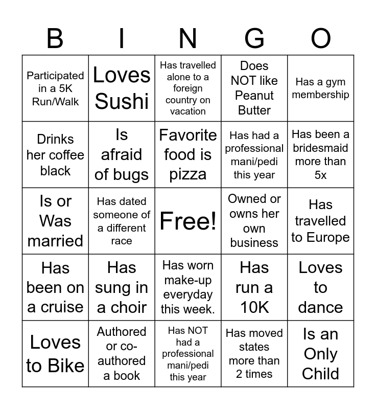 This bingo card has a free space and 24 words: Has sung in a choir, Authored or co-authored a book, Favorite food is pizza, Loves to Bike, Has a gym membership, Participated in a 5K Run/Walk, Drinks her coffee black, Loves Sushi, Owned or owns her own business, Has worn make-up everyday this week., Has had a professional mani/pedi this year, Is or Was married, Has run a 10K, Loves to dance, Is afraid of bugs, Has moved states more than 2 times, Has travelled to Europe, Has travelled alone to a foreign country on vacation, Has been a bridesmaid more than 5x, Has dated someone of a different race, Is an Only Child, Has been on a cruise, Does NOT like Peanut Butter and Has NOT had a professional mani/pedi this year.