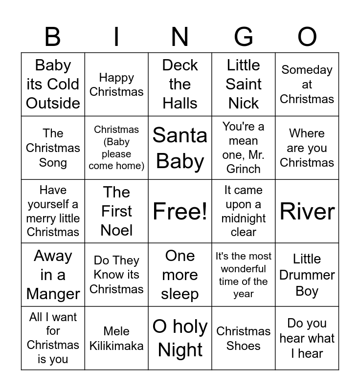 This bingo card has a free space and 51 words: Feliz Navidad, Do you hear what I hear, Last Christmas, O holy Night, Do They Know its Christmas, Mary Did you know?, Happy Christmas, Grandma got ran over by a Reindeer, The Christmas Song, Rudolph the red nosed reindeer, Christmas (Baby please come home), Little Saint Nick, Little Drummer Boy, It's the most wonderful time of the year, Blue Christmas, Miss You Most, Santa Baby, It came upon a midnight clear, I saw mommy kissing Santa Claus, Someday at Christmas, The First Noel, Christmas Shoes, Baby its Cold Outside, You're a mean one, Mr. Grinch, Dominick The Donkey, Rocking around the Christmas Tree, Where are you Christmas, A holly Jolly Christmas, All I want for Christmas is you, Deck the Halls, Up on the house top, Frosty the Snowman, Wonderful Christmastime, Mistletoe, Here comes Santa Claus, Mele Kilikimaka, Twelve days of Christmas, I want a Hippo, My grown up Christmas List, I'll be home for Christmas, River, Away in a Manger, Merry Christmas Baby, Santa Claus is coming to town, Jingle Bell Rock, Santa Tell me, Have yourself a merry little Christmas, Under the Mistletoe, The Chipmunk Song, One more sleep and Run Rudolph Run.