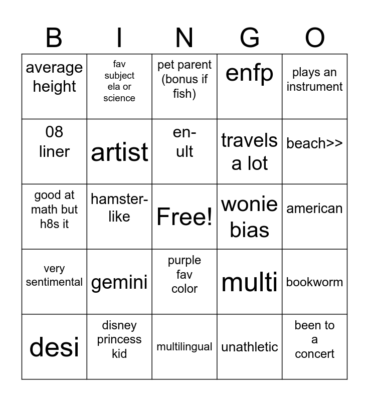 This bingo card has a free space and 24 words: gemini, disney princess kid, en- ult, desi, plays an instrument, average height, 08 liner, fav subject ela or science, wonie bias, purple fav color, travels a lot, good at math but h8s it, multi, bookworm, artist, unathletic, american, pet parent (bonus if fish), beach>>, hamster-like, been to a concert, very sentimental, enfp and multilingual.