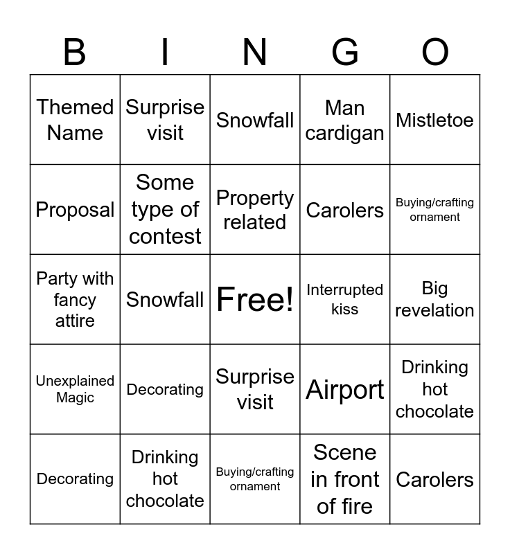 ⚠ This card has duplicate items: Themed Name (2), Carolers (2), Snowmen/snow play (2), Buying/crafting ornament (2), Decorating (2), Some type of lie/betrayal (2), Surprise visit (2), Unexplained Magic (2), Proposal (2), Travel/plan disruption (2), Some type of contest (2), Man cardigan (2), Drinking hot chocolate (2), Airport (2), Opens over city scape (2), Big revelation (2), Property related (2), Interrupted kiss (2), Kiss at final scene of movie (2), Mistletoe (2), Snowfall (2), Scene in front of fire (2)