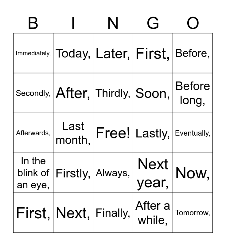 This bingo card has a free space and 24 words: Firstly,, Next,, Thirdly,, First,, Before,, Immediately,, Secondly,, Today,, Lastly,, Always,, Soon,, Afterwards,, Next year,, Now,, After,, After a while,, Eventually,, Later,, Before long,, Last month,, Tomorrow,, In the blink of an eye,, First, and Finally,.