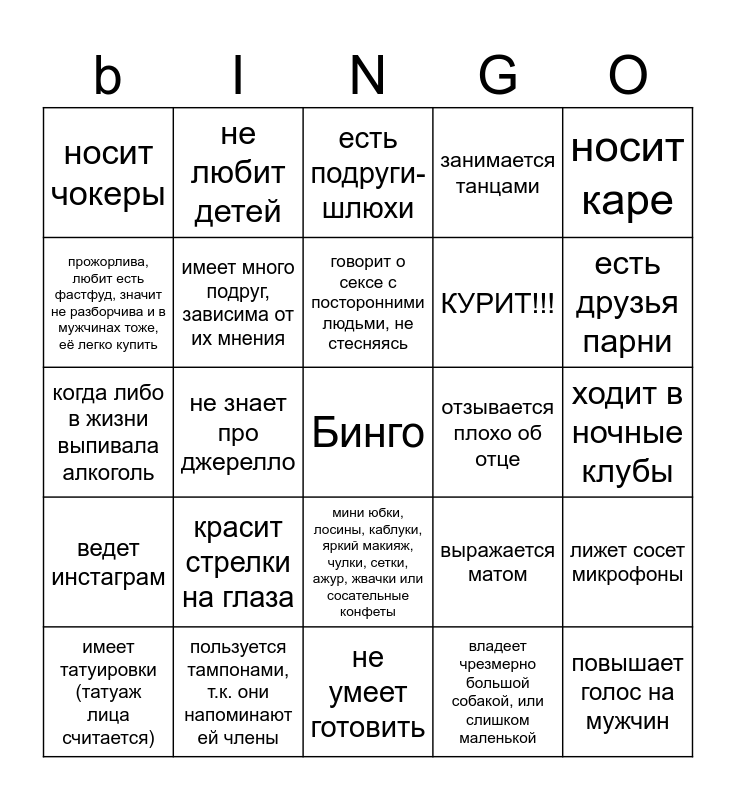 This bingo card has a free space and 24 words: красит стрелки на глаза, пользуется тампонами, т.к. они напоминают ей члены, говорит о сексе с посторонними людьми, не стесняясь, имеет татуировки (татуаж лица считается), носит каре, носит чокеры, прожорлива, любит есть фастфуд, значит не разборчива и в мужчинах тоже, её легко купить, не любит детей, отзывается плохо об отце, мини юбки, лосины, каблуки, яркий макияж, чулки, сетки, ажур, жвачки или сосательные конфеты, КУРИТ!!!, когда либо в жизни выпивала алкоголь, выражается матом, лижет сосет микрофоны, имеет много подруг, зависима от их мнения, владеет чрезмерно большой собакой, или слишком маленькой, ходит в ночные клубы, есть подруги-шлюхи, есть друзья парни, не знает про джерелло, повышает голос на мужчин, ведет инстаграм, занимается танцами and не умеет готовить.