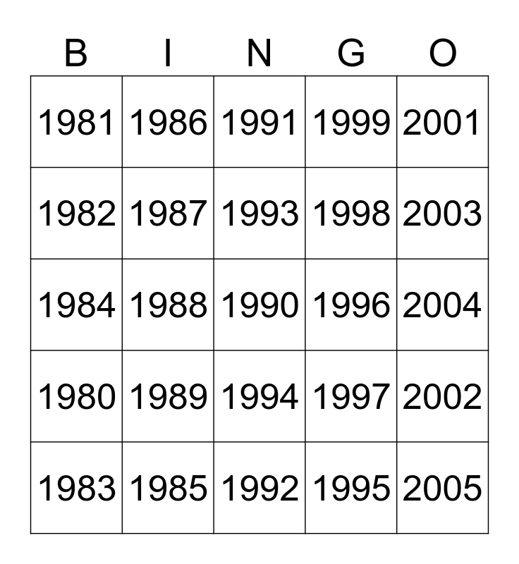 This bingo card has 25 words: 1980, 1985, 1990, 1995, 2001, 1981, 1986, 1991, 1996, 2002, 1982, 1987, 1992, 1997, 2003, 1983, 1988, 1993, 1998, 2004, 1984, 1989, 1994, 1999 and 2005.