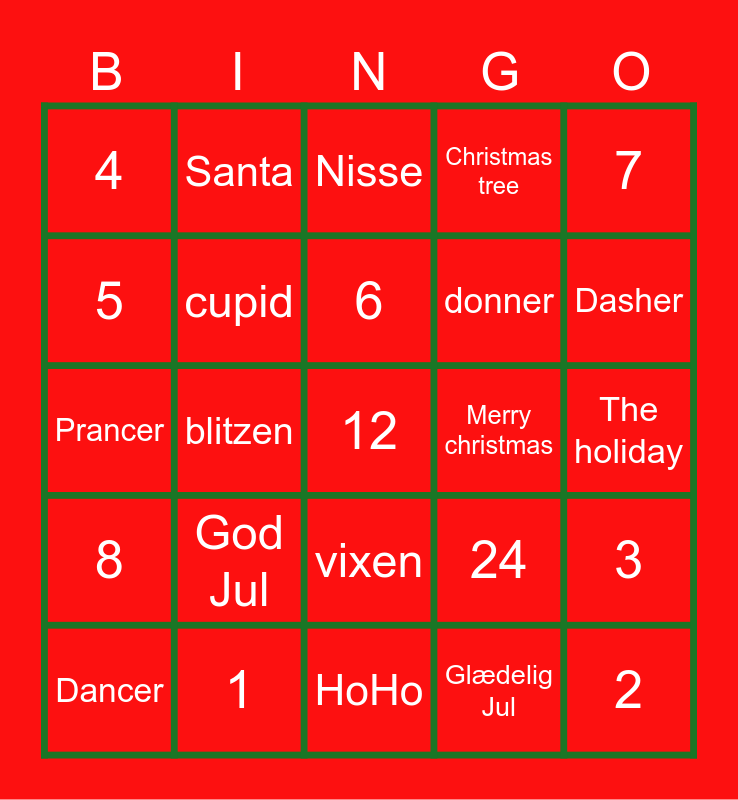 This bingo card has 25 words: God Jul, HoHo, 6, Dancer, 7, 4, 5, Santa, Merry christmas, vixen, donner, Prancer, 24, 3, cupid, 2, The holiday, Nisse, Dasher, blitzen, 12, 1, 8, Christmas tree and Glædelig Jul.