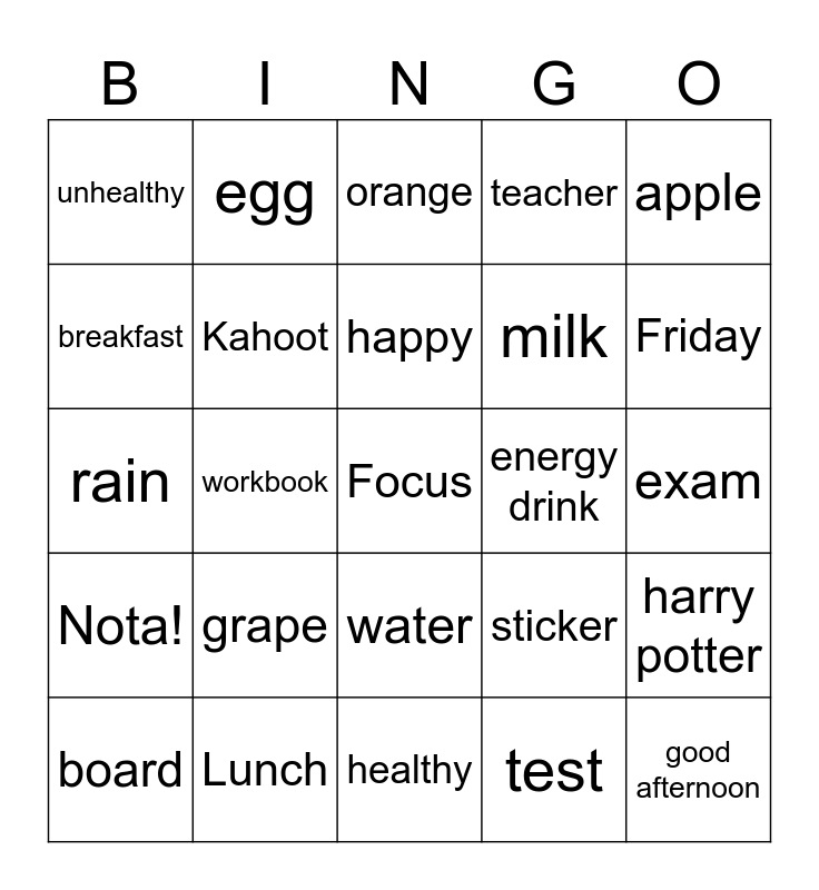 This bingo card has 25 words: grape, healthy, happy, board, apple, unhealthy, breakfast, egg, energy drink, water, milk, rain, sticker, harry potter, Kahoot, good afternoon, exam, orange, Friday, workbook, Focus, Lunch, Nota!, teacher and test.