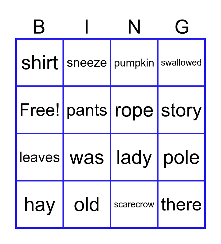 This bingo card has 16 words: old, pole, pumpkin, shirt, leaves, sneeze, lady, scarecrow, Free!, pants, hay, swallowed, was, story, rope and there.