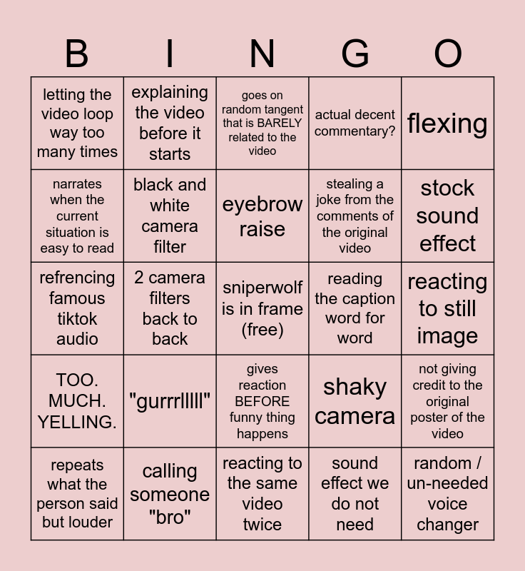 This bingo card has a free space and 36 words: Silent for 5 whole seconds, "if i was in that situation", victim blaming, black and white camera filter, shaky camera, TOO. MUCH. YELLING., eyebrow raise, weird mr beast type subtitles (does not count for the intro), flexing, obviously fake laugh, 2 camera filters back to back, actual decent commentary?, random graphic that adds nothing, reading the caption word for word, stock sound effect, letting the video loop way too many times, summarized the video, "gurrrlllll", random / un-needed voice changer, goes on random tangent that is BARELY related to the video, reacting to still image, not giving credit to the original poster of the video, calling someone "bro", repeats what the person said but louder, reacting to the same video twice, explaining the video before it starts, refrencing famous tiktok audio, the channel they credited didn't make the video in the first place, stealing a joke from the comments of the original video, narrates when the current situation is easy to read, talking about her hair for some reason, doing an accent thats not her own, sound effect we do not need, gives reaction BEFORE funny thing happens, "uh ohhhhh" and "uhmmm".