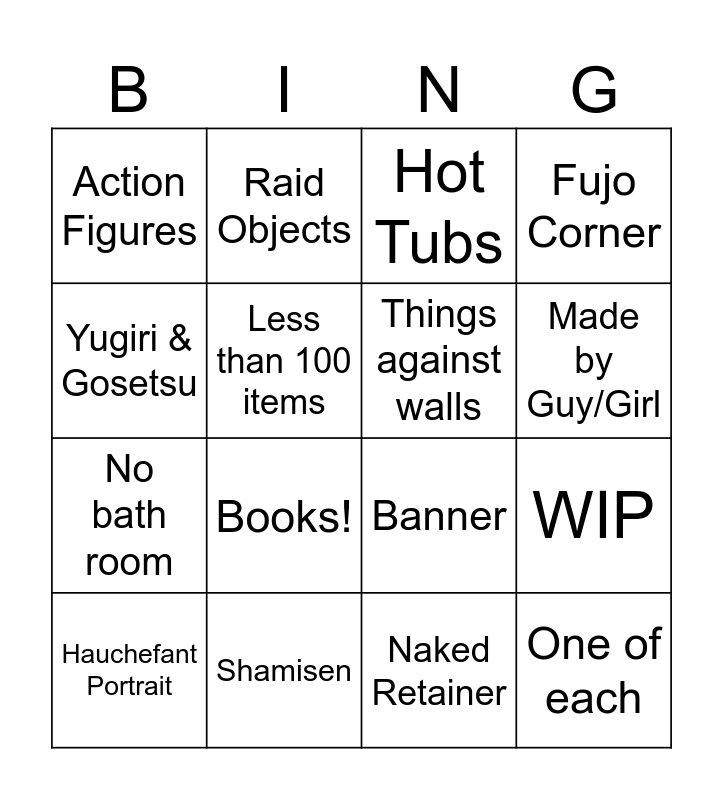This bingo card has 16 words: Shamisen, WIP, Hot Tubs, Action Figures, No bath room, Raid Objects, Banner, Naked Retainer, Yugiri & Gosetsu, Less than 100 items, Hauchefant Portrait, Fujo Corner, Books!, Made by Guy/Girl, Things against walls and One of each.