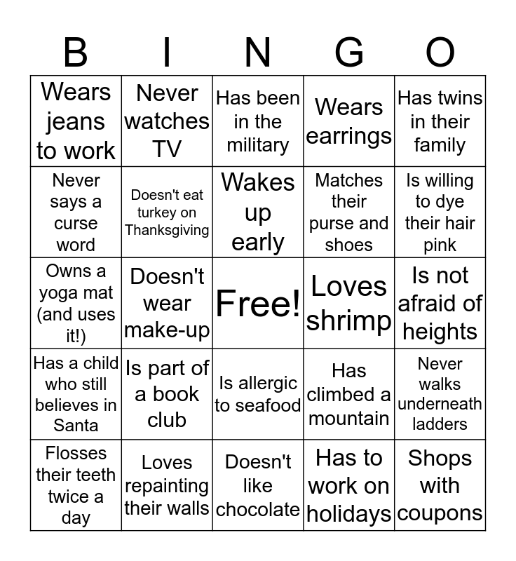 This bingo card has a free space and 24 words: Is part of a book club, Loves repainting their walls, Wakes up early, Flosses their teeth twice a day, Has twins in their family, Wears jeans to work, Never says a curse word, Never watches TV, Loves shrimp, Is allergic to seafood, Matches their purse and shoes, Owns a yoga mat (and uses it!), Has climbed a mountain, Never walks underneath ladders, Doesn't eat turkey on Thanksgiving, Has to work on holidays, Is not afraid of heights, Has been in the military, Is willing to dye their hair pink, Doesn't wear make-up, Shops with coupons, Has a child who still believes in Santa, Wears earrings and Doesn't like chocolate.