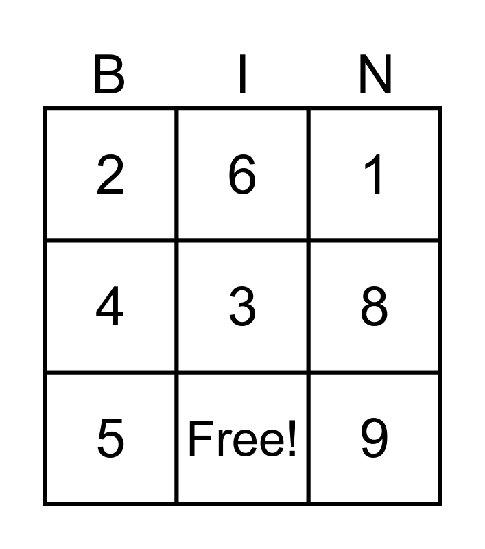This bingo card has 10 words: Free!, 1, 2, 3, 4, 5, 6, 7, 8 and 9.