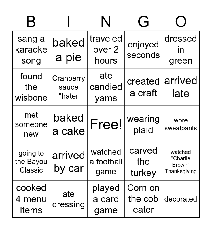 This bingo card has a free space and 24 words: arrived by car, ate dressing, ate candied yams, cooked 4 menu items, dressed in green, sang a karaoke song, found the wisbone, baked a pie, wearing plaid, watched a football game, created a craft, met someone new, carved the turkey, watched "Charlie Brown" Thanksgiving, Cranberry sauce "hater, Corn on the cob eater, wore sweatpants, traveled over 2 hours, arrived late, baked a cake, decorated, going to the Bayou Classic, enjoyed seconds and played a card game.
