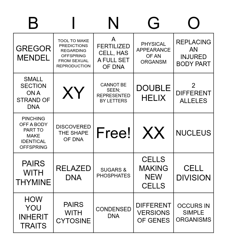 This bingo card has a free space and 24 words: RELAZED DNA, PAIRS WITH CYTOSINE, CANNOT BE SEEN; REPRESENTED BY LETTERS, HOW YOU INHERIT TRAITS, REPLACING AN INJURED BODY PART, GREGOR MENDEL, SMALL SECTION ON A STRAND OF DNA, TOOL TO MAKE PREDICTIONS REGARDING OFFSPRING FROM SEXUAL REPRODUCTION, XX, SUGARS & PHOSPHATES, DOUBLE HELIX, PINCHING OFF A BODY PART TO MAKE IDENTICAL OFFSPRING, CELLS MAKING NEW CELLS, CELL DIVISION, XY, DIFFERENT VERSIONS OF GENES, NUCLEUS, A FERTILIZED CELL, HAS A FULL SET OF DNA, 2 DIFFERENT ALLELES, DISCOVERED THE SHAPE OF DNA, OCCURS IN SIMPLE ORGANISMS, PAIRS WITH THYMINE, PHYSICAL APPEARANCE OF AN ORGANSM and CONDENSED DNA.
