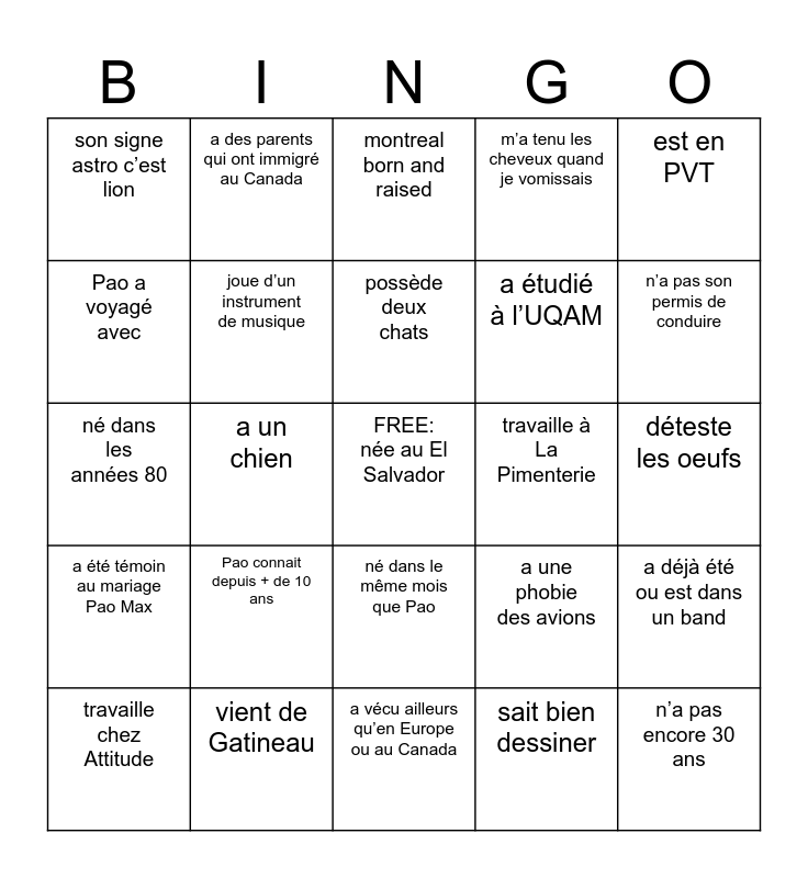 This bingo card has a free space and 24 words: Pao connait depuis + de 10 ans, vient de Gatineau, possède deux chats, travaille chez Attitude, est en PVT, son signe astro c’est lion, Pao a voyagé avec, a des parents qui ont immigré au Canada, travaille à La Pimenterie, né dans le même mois que Pao, a étudié à l’UQAM, né dans les années 80, a une phobie des avions, a déjà été ou est dans un band, joue d’un instrument de musique, sait bien dessiner, déteste les oeufs, montreal born and raised, n’a pas son permis de conduire, a un chien, n’a pas encore 30 ans, a été témoin au mariage Pao Max, m’a tenu les cheveux quand je vomissais and a vécu ailleurs qu’en Europe ou au Canada.