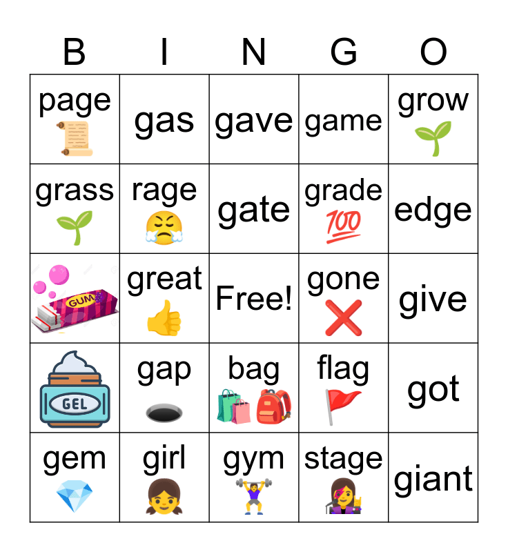This bingo card has 3 images, a free space and 26 words: gem π, germ π¦ , great π, go πΆββοΈ, page π, gave, rage π€, gap π³οΈ, gone β, girl π§, give, giant, gym ποΈββοΈ, stage π©βπ€, edge, grass πΎ, bag ποΈπ, grow π±, flag π©, grade π―, grass π±, game, gas, got, gate and goose.