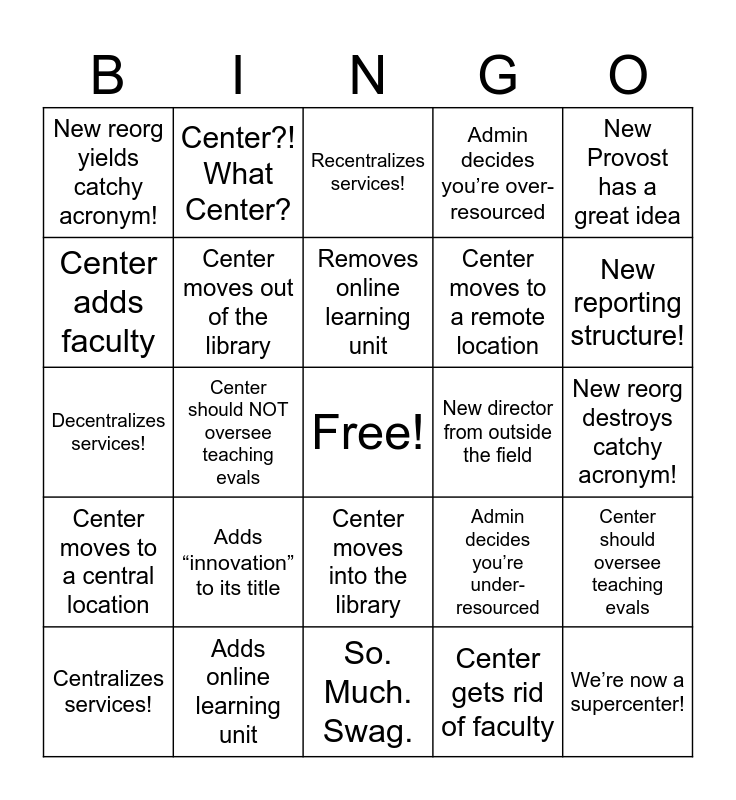 This bingo card has a free space and 24 words: Adds “innovation” to its title, Adds online learning unit, Removes online learning unit, Centralizes services!, New Provost has a great idea, New reorg yields catchy acronym!, Center adds faculty, Center?! What Center?, New director from outside the field, Center moves into the library, Center moves to a remote location, Decentralizes services!, Admin decides you’re under-resourced, Center should oversee teaching evals, Center moves out of the library, Center gets rid of faculty, New reorg destroys catchy acronym!, Recentralizes services!, New reporting structure!, Center should NOT oversee teaching evals, We’re now a supercenter!, Center moves to a central location, Admin decides you’re over-resourced and So. Much. Swag..
