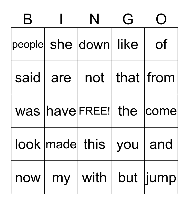 This bingo card has a free space and 24 words: made, my, not, now, of, people, said, she, the, this, that, was, you, and, are, but, come, down, from, have, jump, look, like and with.