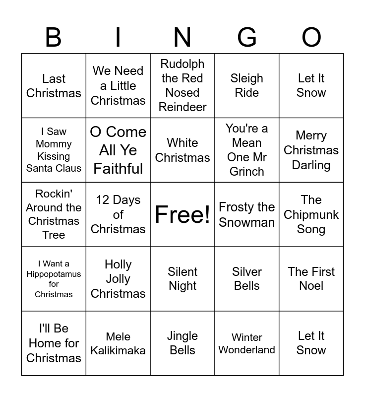 This bingo card has a free space and 46 words: Santa Claus is Coming to Town, Let It Snow, The Christmas Song, Jingle Bells, Holly Jolly Christmas, No Place Like Home For the Holidays, We Need a Little Christmas, Jingle Bell Rock, I Saw Mommy Kissing Santa Claus, Blue Christmas, O Come All Ye Faithful, Sleigh Ride, The First Noel, Silver Bells, Carol of the Bells, My Favorite Things, White Christmas, Frosty the Snowman, Run Rudolph Run, Let It Snow, 12 Days of Christmas, Winter Wonderland, Last Christmas, You're a Mean One Mr Grinch, Please Come Home for Christmas, Merry Christmas Darling, I'll Be Home for Christmas, Feliz Navidad, Silent Night, I Want a Hippopotamus for Christmas, Joy To the World, Here Comes Santa Claus, Santa Baby, O Holy Night, Up On the Housetop, Mele Kalikimaka, The Chipmunk Song, Away In a Manger, Grandma Go Run Over by a Reindeer, Do They Know It's Christmas, Wonderful Christmas Time, Rudolph the Red Nosed Reindeer, Rockin' Around the Christmas Tree, Have Yourself a Merry Little Christmas, Its Beginning to Look a Lot Like Christmas and It's the Most Wonderful Time of the Year.