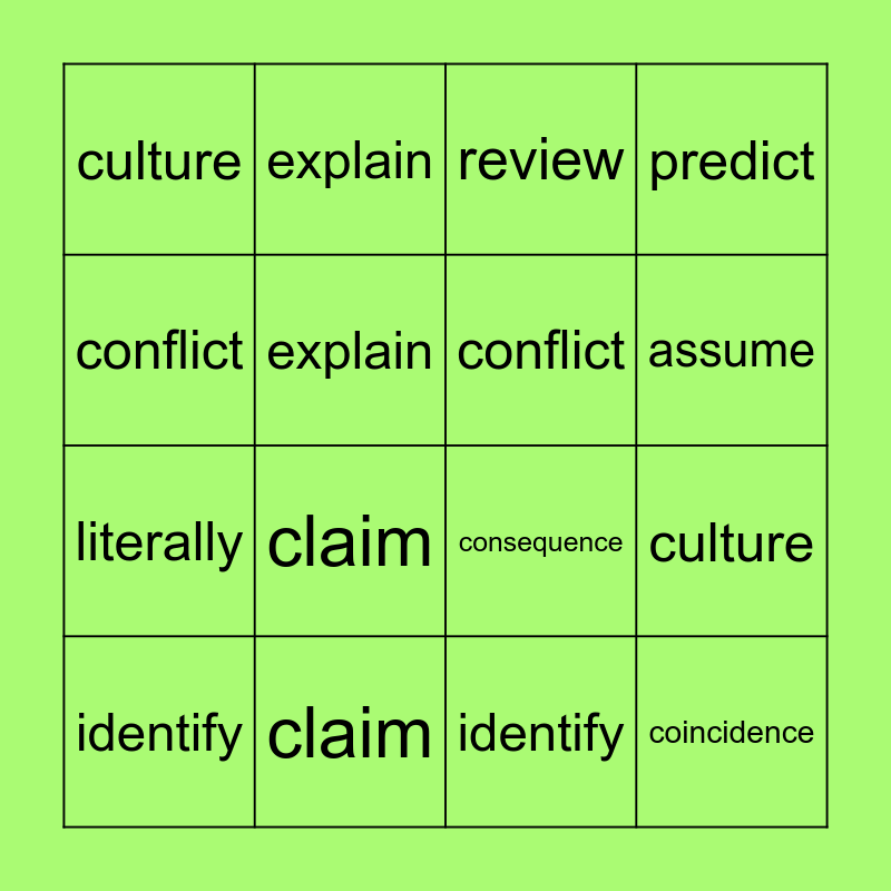 This bingo card has 21 words: claim, avoid, explain, gist, identify, conflict, culture, review, consequence, assume, literally, predict, coincidence, avoid, explain, gist, identify, claim, conflict, culture and review.