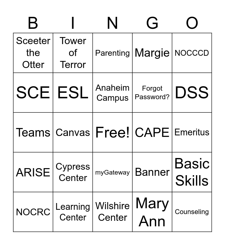 This bingo card has a free space and 25 words: Cypress Center, Wilshire Center, Anaheim Campus, NOCRC, NOCCCD, Sceeter the Otter, SCE, Tower of Terror, CAPE, myGateway, Forgot Password?, Teams, Banner, Basic Skills, ESL, CTE, Emeritus, Parenting, DSS, Canvas, Counseling, Learning Center, ARISE, Margie and Mary Ann.