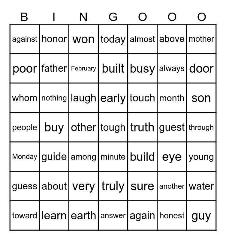 This bingo card has 59 words: forty, people, pretty, nothing, other, another, mother, brother, father, water, today, very, above, among, again, against, always, almost, floor, poor, door, won, son, month, hour, minute, Monday, Wednesday, February, eye, heart, about, answer, honest, honor, truth, truly, busy, build, built, sure, laugh, whom, whose, through, toward, learn, earth, early, buy, guy, guess, guest, guide, young, touch, enough, tough and rough.