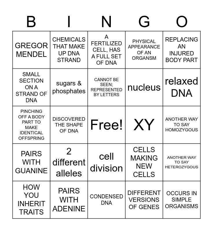 This bingo card has a free space and 24 words: 2 different alleles, PAIRS WITH ADENINE, CANNOT BE SEEN; REPRESENTED BY LETTERS, HOW YOU INHERIT TRAITS, REPLACING AN INJURED BODY PART, GREGOR MENDEL, SMALL SECTION ON A STRAND OF DNA, CHEMICALS THAT MAKE UP DNA STRAND, XY, cell division, nucleus, PINCHING OFF A BODY PART TO MAKE IDENTICAL OFFSPRING, CELLS MAKING NEW CELLS, ANOTHER WAY TO SAY HETEROZYGOUS, sugars & phosphates, DIFFERENT VERSIONS OF GENES, ANOTHER WAY TO SAY HOMOZYGOUS, A FERTILIZED CELL, HAS A FULL SET OF DNA, relaxed DNA, DISCOVERED THE SHAPE OF DNA, OCCURS IN SIMPLE ORGANISMS, PAIRS WITH GUANINE, PHYSICAL APPEARANCE OF AN ORGANSM and CONDENSED DNA.