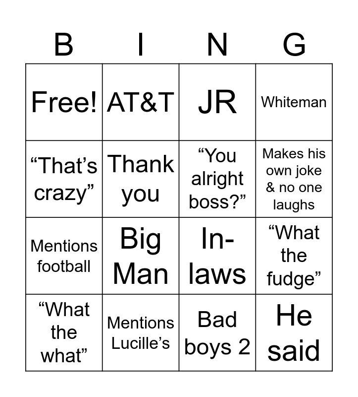 This bingo card has 16 words: “What the what”, Mentions Lucille’s, JR, Whiteman, “That’s crazy”, AT&T, In-laws, “What the fudge”, Free!, Thank you, Bad boys 2, Makes his own joke & no one laughs, Mentions football, Big Man, “You alright boss?” and He said.