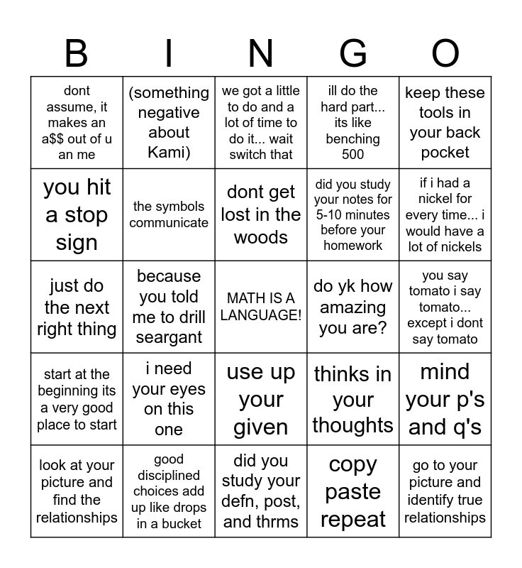 This bingo card has a free space and 24 words: i need your eyes on this one, good disciplined choices add up like drops in a bucket, dont get lost in the woods, look at your picture and find the relationships, keep these tools in your back pocket, dont assume, it makes an a$$ out of u an me, you hit a stop sign, (something negative about Kami), do yk how amazing you are?, use up your given, did you study your notes for 5-10 minutes before your homework, just do the next right thing, thinks in your thoughts, mind your p's and q's, the symbols communicate, copy paste repeat, you say tomato i say tomato... except i dont say tomato, we got a little to do and a lot of time to do it... wait switch that, if i had a nickel for every time... i would have a lot of nickels, because you told me to drill seargant, go to your picture and identify true relationships, start at the beginning its a very good place to start, ill do the hard part... its like benching 500 and did you study your defn, post, and thrms.