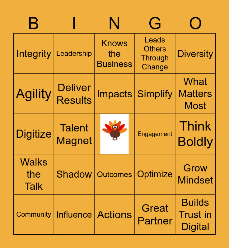 This bingo card has a free space and 24 words: Shadow, Influence, Impacts, Community, Diversity, Integrity, Agility, Leadership, Engagement, Outcomes, Simplify, Digitize, Optimize, Grow Mindset, Deliver Results, Great Partner, Think Boldly, Knows the Business, What Matters Most, Talent Magnet, Builds Trust in Digital, Walks the Talk, Leads Others Through Change and Actions.