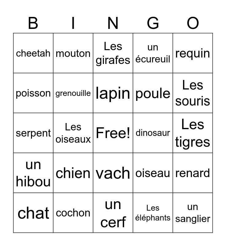This bingo card has a free space and 24 words: chien, cochon, lapin, chat, requin, cheetah, poisson, mouton, dinosaur, vach, poule, serpent, oiseau, renard, grenouille, Les éléphants, Les tigres, Les girafes, Les souris, Les oiseaux, un sanglier, un hibou, un écureuil and un cerf.