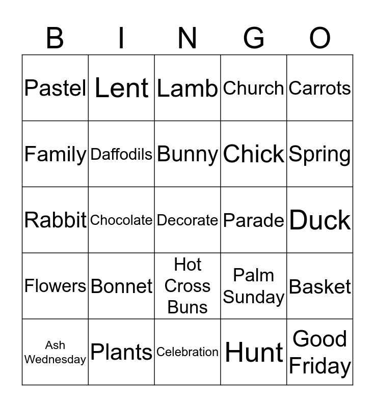 This bingo card has 38 words: Easter, Eggs, Tulips, Daffodils, Basket, Bonnet, Bunny, Candy, Carrots, Chick, Chocolate, Church, Decorate, Duck, Family, Flowers, Jelly Beans, Lamb, Nest, Parade, Pastel, Plants, Spring, Ash Wednesday, Baking, Celebration, Good Friday, God, Happy Easter, Holiday, Hop, Hot Cross Buns, Hunt, Lent, Maudy Thursday, Palm Sunday, Rabbit and Shrove Tuesday.