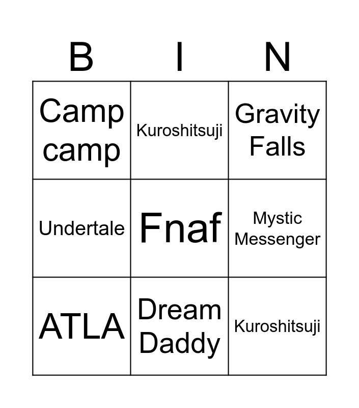 This bingo card has a free space and 8 words: Mystic Messenger, Gravity Falls, Kuroshitsuji, ATLA, Camp camp, Kuroshitsuji, Undertale and Dream Daddy.
