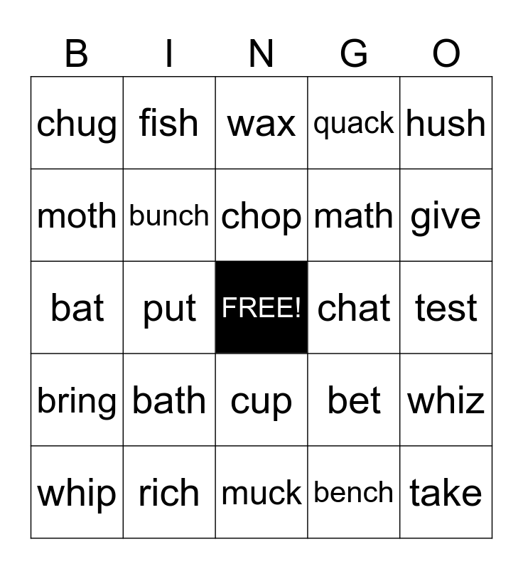 This bingo card has a free space and 24 words: bath, rich, chop, whip, hush, chug, moth, fish, chat, cup, math, bat, bet, whiz, bunch, bench, test, wax, give, put, take, bring, quack and muck.