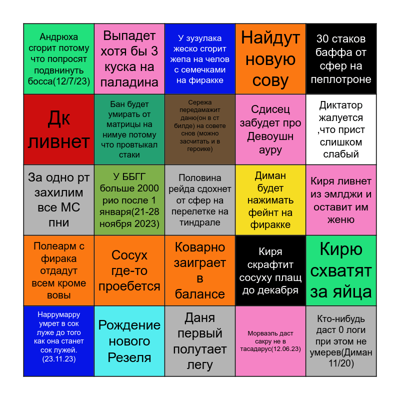 This bingo card has 29 words: Наррумарру умрет в сок луже до того как она станет сок лужей.(23.11.23), У Адика будет больше 6 боссов с 95+ хпс логами, У ББГГ больше 2000 рио после 1 января(21-28 ноября 2023), Кто-нибудь даст 0 логи при этом не умерев(Диман 11/20), Андрюха сгорит потому что попросят подвнинуть босса(12/7/23), У зузулака жеско сгорит жепа на челов с семечками на фиракке, Бан будет умирать от матрицы на нимуе потому что провтыкал стаки, Сосух где-то проебется, Диман будет нажимать фейнт на фиракке, Рождение нового Резеля, Киря ливнет из эмлджи и оставит им женю, Половина рейда сдохнет от сфер на перелетке на тиндрале, Даня первый полутает легу, Морваэль даст сакру не в тасадарус(12.06.23), Диктатор жалуется ,что прист слишком слабый, Дальмера забыл про даркнесс, Коварно заиграет в балансе, Полеарм с фирака отдадут всем кроме вовы, 30 стаков баффа от сфер на пеплотроне, За одно рт захилим все МС пни, Киря скрафтит сосуху плащ до декабря, Зейзулак топ 1 по хпсу, Сдисец забудет про Девоушн ауру, Дк ливнет, Найдут новую сову, Выпадет хотя бы 3 куска на паладина, Кирю схватят за яйца, Сережа передамажит даню(он в ст билде) на совете снов (можно засчитать и в героике) and Дальмера даст рывок скверны в орбу на пеплотроне.