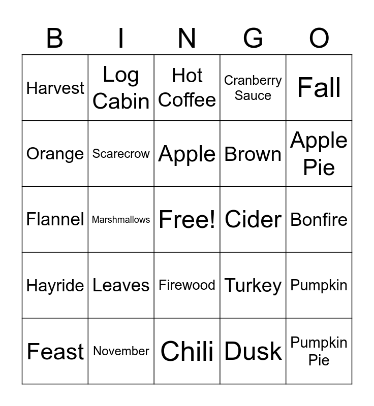 This bingo card has a free space and 36 words: Cornucopia, Pumpkin Spice, Thanksgiving, Scarecrow, Turkey, Hayride, Apple, Acorns, Fall, Scarf, Marshmallows, Cranberry Sauce, Thanksgiving, Cider, Apple Pie, Harvest, Sweater, Leaves, Pumpkin Pie, Hot Coffee, Bonfire, Pumpkin, November, Feast, Chili, Log Cabin, Flannel, Cold Weather, Brown, Orange, Yellow, Berries, Dusk, Firewood, Gravy and Orchard.